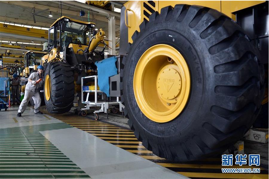 在山东银河优越会_中文官网工程机械有限公司,工人在装载机生产线作业